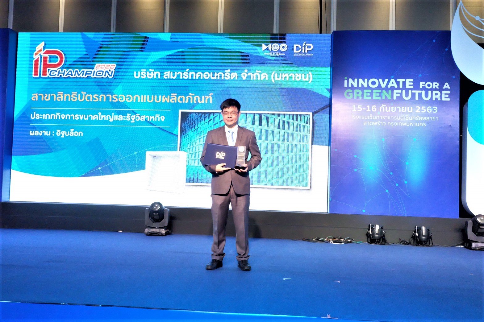 บริษัท สมาร์ทคอนกรีต จำกัด (มหาชน) เข้ารับรางวัลชนะเลิศทรัพย์สินทางปัญญาดีเด่น สาขาสิทธิบัตรการออกแบบผลิตภัณฑ์ (IP Champion 2020) ประเภทอิฐบล็อก ได้แก่สินค้า สมาร์ท มิติบล็อค ด้วยมิติใหม่ของผนังกึ่งสำเร็จรูป โดดเด่นด้วยการออกแบบผลิตภัณฑ์ที่ช่วยเสริมเรื่องแสงและเงาให้ผนังดูโดดเด่นมีมิติสวยงาม โดยได้รับเกียรติจากคุณทศพล ทังสุบุตร อธิบดีกรมทรัพย์สินทางปัญญา ให้เกียรติมอบรางวัลและเป็นประธานในพิธี ณ ห้องวิภาวดีบอลรูม โรงแรมเซ็นทารา แกรนด์ เซ็นทรัลพลาซ่า ลาดพร้าว เมื่อวันที่ 15 กันยายน 2563 ที่ผ่านมา