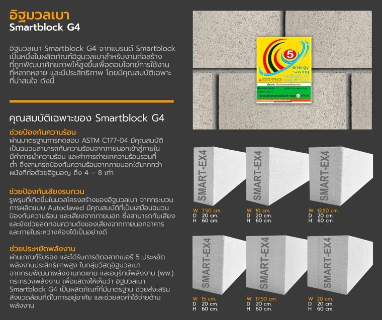 ผ่านเกณฑ์รับรอง และได้รับการติดฉลากเบอร์ 5 ประหยัดพลังงานประสิทธิภาพสูง ในกลุ่มวัสดุอิฐมวลเบา จากกรมพัฒนาพลังงานทดแทน และอนุรักษ์พลังงาน (พพ.) กระทรวงพลังงาน เพื่อแสดงให้เห็นว่า อิฐมวลเบา สมาร์ทบล็อค G4 เป็นผลิตภัณฑ์ที่มีมาตรฐาน ช่วยส่งเสริมสิ่งแวดล้อมที่ดีในการอยู่อาศัย และช่วยลดค่าใช้จ่ายด้านพลังงาน