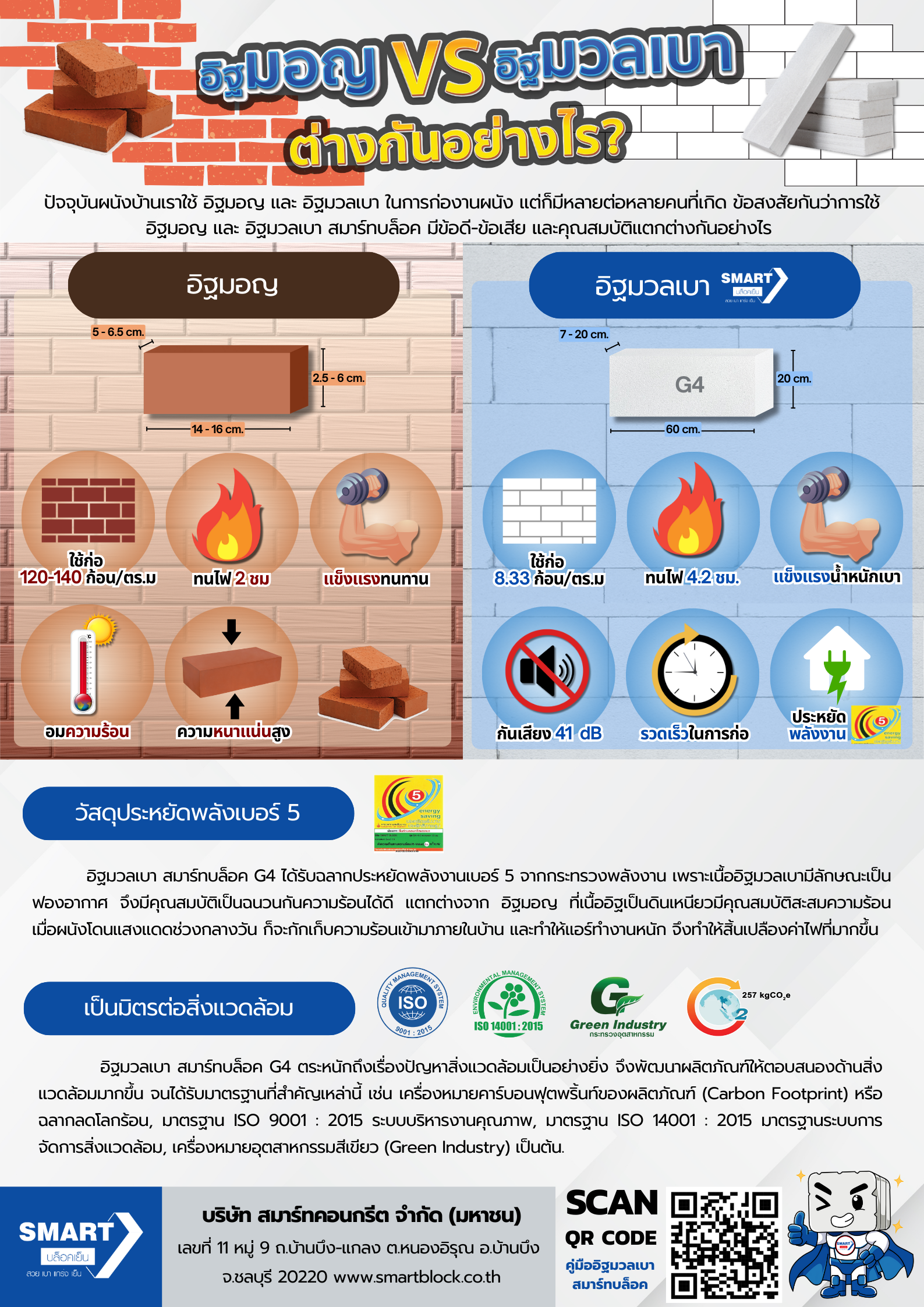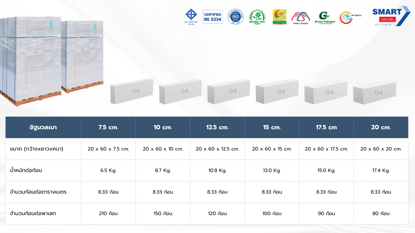 อิฐมวลเบา หรือ คอนกรีตมวลเบา สมาร์ทบล็อค G4 ประหยัดพลังงาน เบอร์ 5 และผ่านการรับรองเครื่องหมายคาร์บอนฟุตพริ้นท์ ด้านผลิตภัณฑ์ที่ช่วยลดการปล่อยก๊าซเรือนกระจกเป็นรายแรกของประเทศไทย
