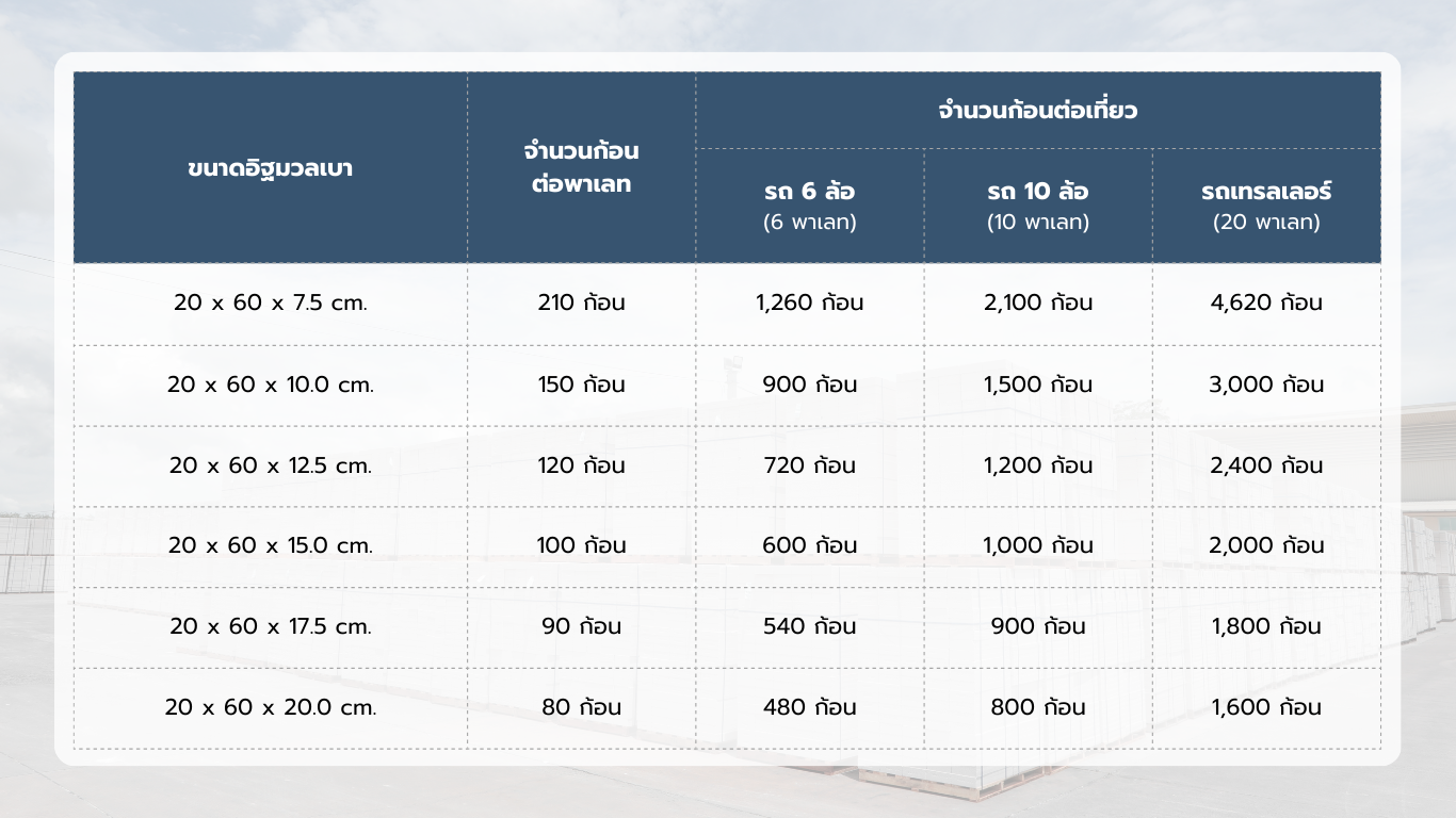 เพื่อความสะดวกในการขนส่ง SMART BLOCK จัดเรียงอิฐมวลเบาใส่พาเลท พร้อมคำนวณจำนวนก้อนต่อเที่ยวได้ดังนี้