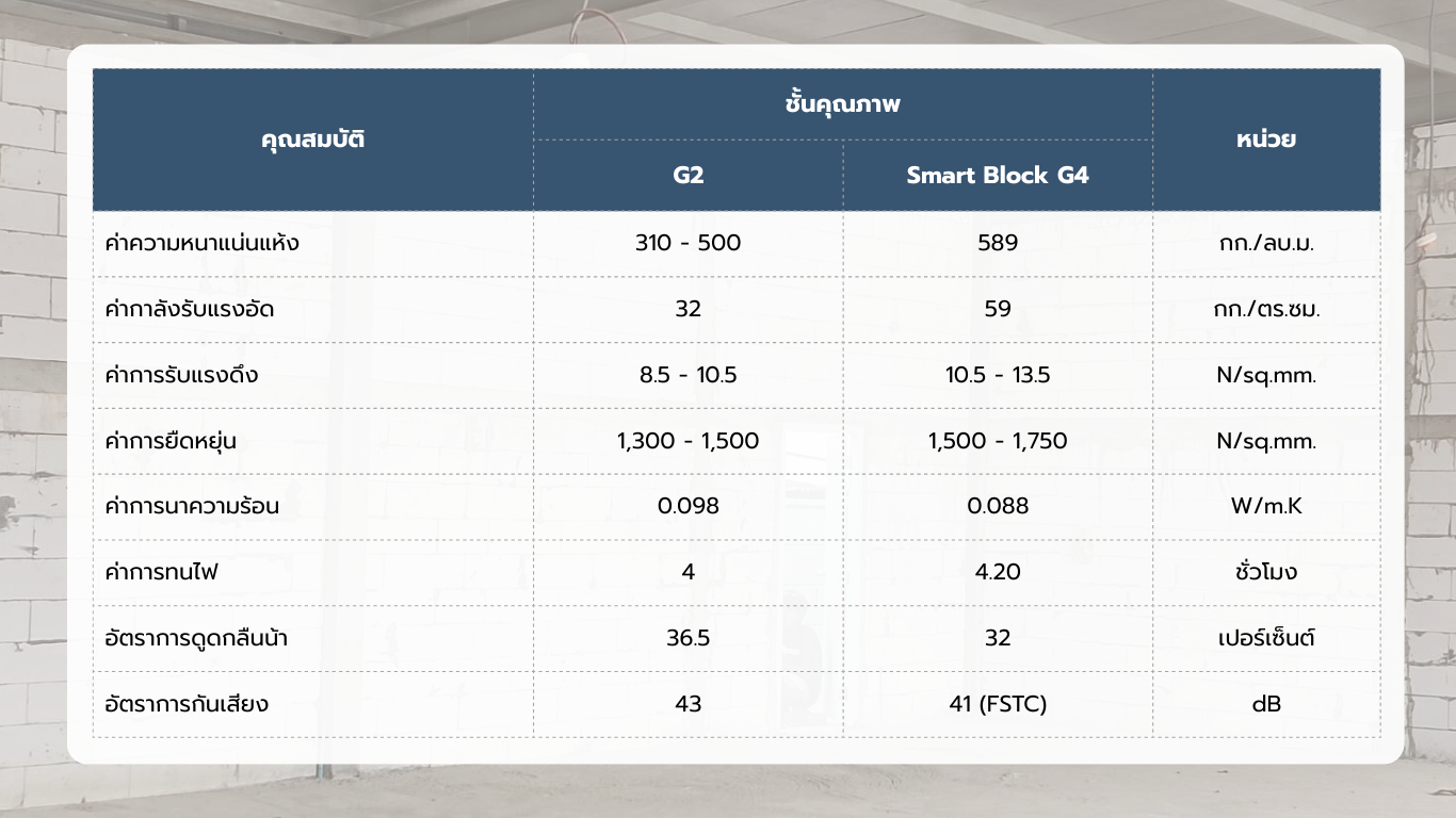 เปรียบเทียบคุณสมบัติ อิฐมวลเบา Smart Block G4 vs อิฐมวลเบา G2